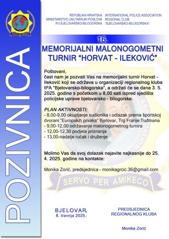 čast nam je pozvati Vas na memorijalni turnir „Horvat-Ileković“ koji se održava u organizaciji regionalnog kluba IPA Bjelovarsko-bilogorska, a održati će se 3.5.2025. godine s početkom u 08,00 sati ispred sjedišta Policijske uprave bjelovarsko-bilogorske.